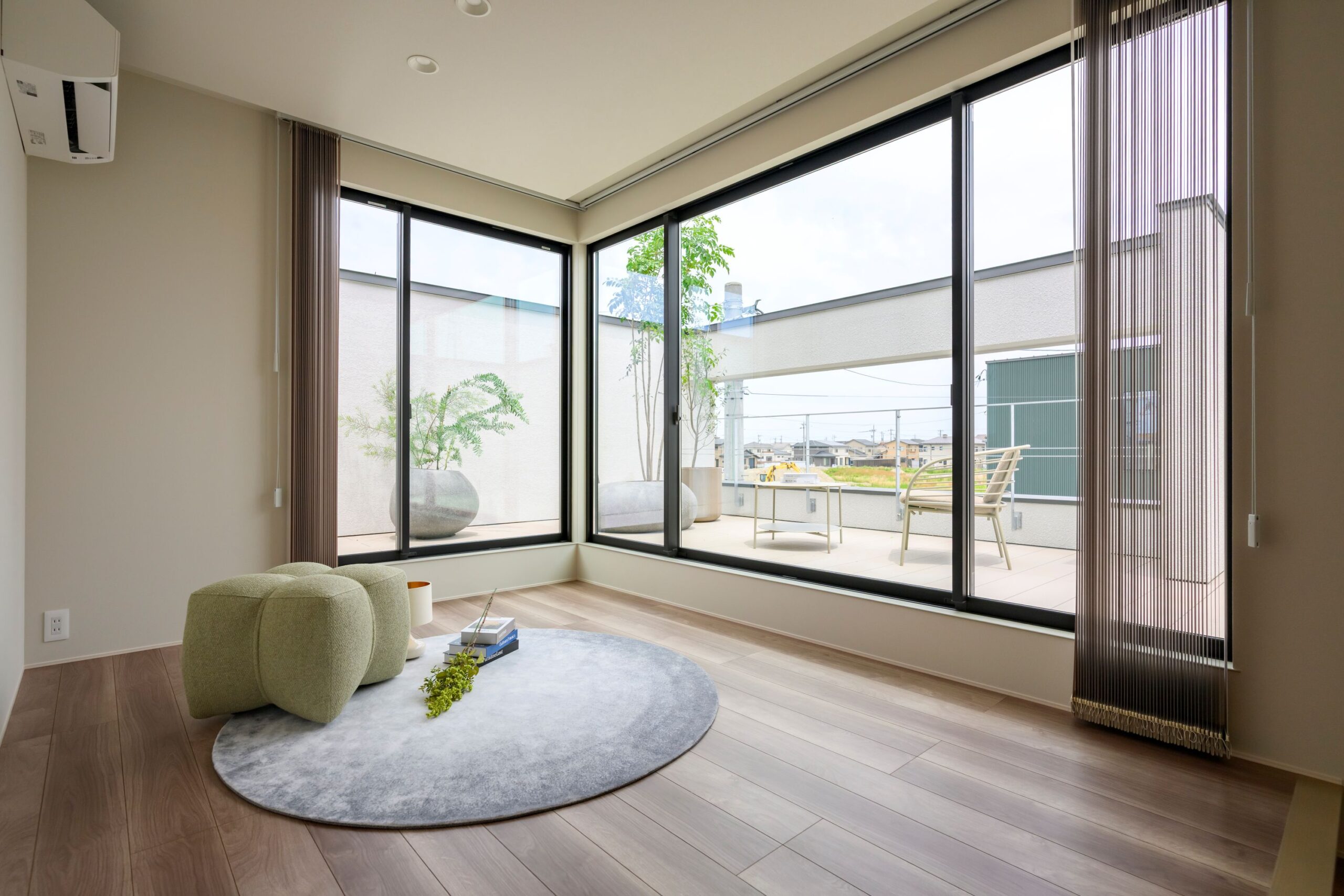 テラスから降り注ぐ柔らかな陽射しと、緑が見えるリビング